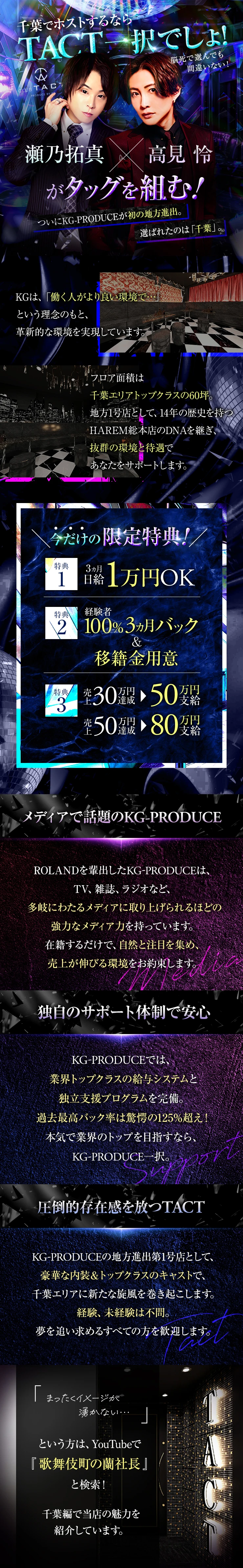 KG-PRODUCE、初の地方進出店『TACT』。有名プレイヤー「瀬乃拓真」とKGブレーンの「高見 怜」がタッグを組み、新たな開拓地として選ばれたのは千葉。大型グループならではの、充実した福利厚生が期待できますね。さらにあのROLANDさんを輩出した、圧倒的なメディア力はお墨付きです。集客力の強さにも期待出来ます。未経験でも、最速で高収入を稼ぎたいなら『TACT』がおススメです!