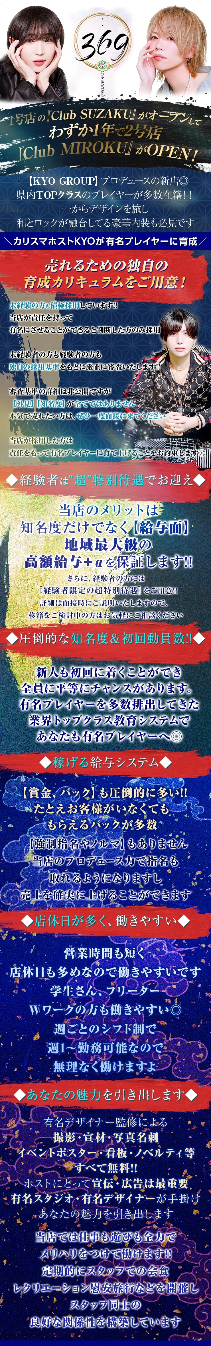 【KYO GROUP】プロデュースの新店!1号店 の『Club SUZAKU』がオープンして、わずか1年で2号店『Club MIROKU』がOPEN!今、勢いのある【KYO GROUP】で、あなたの人生が変わるかも!?数々の有名プレイヤーを輩出してきたグループが、本気で売れっ子に育て上げられると思った方だけを採用◎外見や知名度だけが採用基準ではないそうなので、とにかく上を目指したいと思っている未経験者の方も、チャレンジしてみてください!!