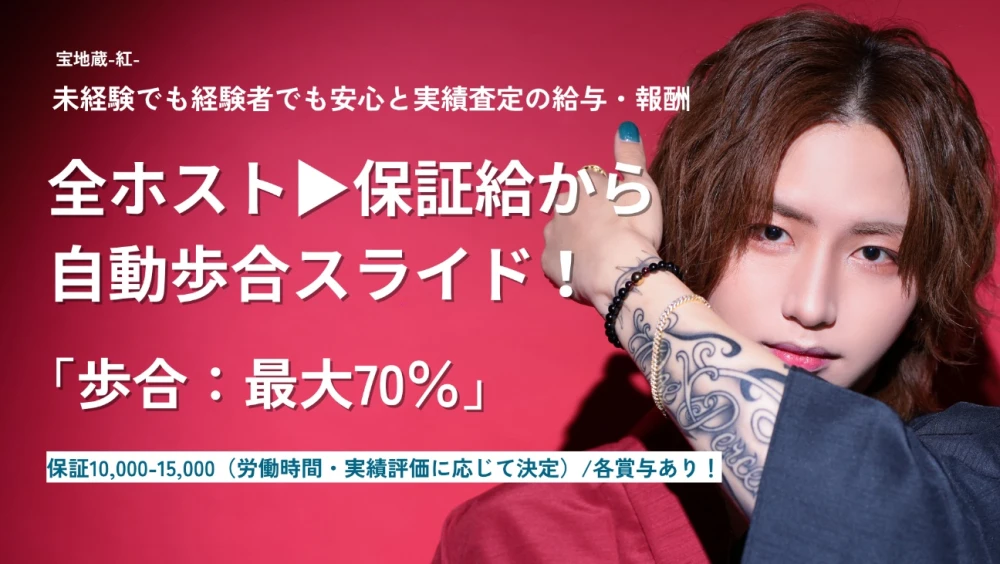 『宝地蔵 -紅-』はホストにとって非常に良い条件を提示してくれるという大阪・ミナミ屈指の人気店!「自分次第で稼げる」体制を用意しているらしく、未経験者や経験者もホストデビューしやすいとのことですよ。独立を目指している方ももちろん大歓迎だとか◎スキルや知識が身に付き、人脈を築ける環境ならではの恩恵が受けられそうですね。気になる給与体系は、日給保証9000円~14000円ほど、売上歩合40%~60%ほどと驚きの稼ぎやすさが魅力だそう。ぜひ同店から新たなホスト人生をスタートしてみてはいかがでしょうか?