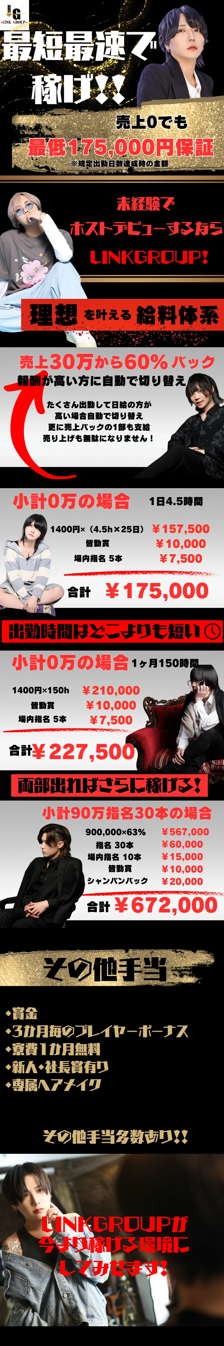 『LINK-ACE』は大手グループ店の系列というホストクラブです!グループでも珍しい高額報酬システムを採用しているようで、稼ぎやすさは抜群!バック率が高いらしく、頑張れば頑張ったぶんリターンがありますよ◎また「罰金なし」「服装髪型自由」という待遇があるみたいで、働きやすさも特徴なんだとか!気になる方はまず体験入店からいかがでしょうか?体入の報酬もかなり魅力的みたいですよ!