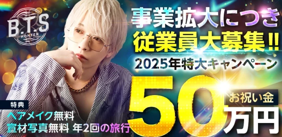 あの「SIX GROUP」から『B.T.S -HONTEN-』様がついにお披露目となりました!B.T.S第二章として、総工費一億円をかけたそう!日収保証や賞金制度など、本店の名にふさわしい充実の高待遇が揃ってるそうです。メディアに力を入れているSIX GROUPなら、新人さんもスグに指名獲得のチャンスが多いとか…!?ホストデビューを考えている未経験の方はもちろん、移籍を検討している経験者の方にもおススメのお店です。