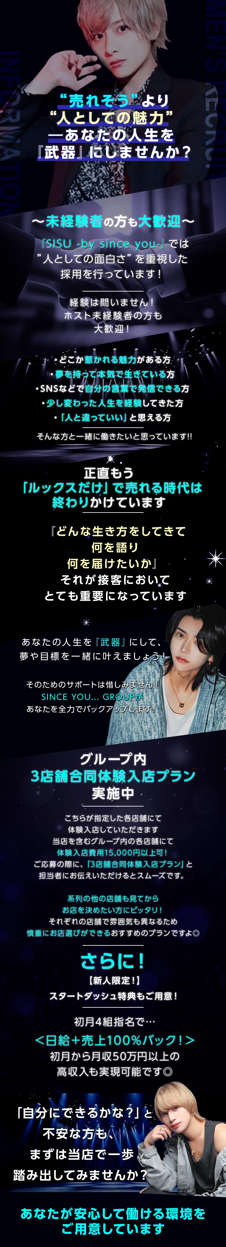 『SISU -by since you-』では、”人としての面白さ”を重視した採用を行っています◎ホスト未経験者の方も大歓迎!SINCE YOU... GROUPがあなたのやる気をバックアップします!現在、【グループ内3店舗合同体験入店プラン】も実施中◎各店舗にて体験入店費用最大3万円を支給!系列店をじっくり見てお店を選びたい方にピッタリのプランですよね♪店内見学だけでもOKとのことなので、未経験で不安がある方も応募しやすいお店ですよ!