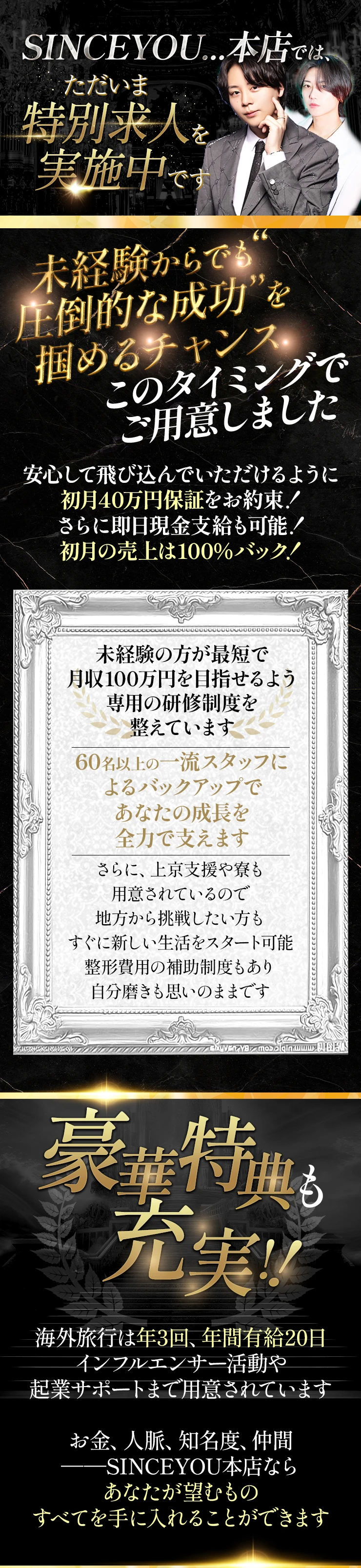 SINCEYOU...本店では、大改装リニューアルを記念した特別求人を実施中です。未経験からでも安心の初月40万円保証に加え、売上100%バックや即日現金支給など、稼げるスタートを用意しました。さらに先輩スタッフ直伝の研修制度で、月収100万円への最短ルートを徹底サポート。寮完備や上京支援、整形費用補助などの福利厚生も万全です。豪華120坪の店内と業界最大級の広告力を誇るSINCEYOU本店で“人生を変える一歩”を踏み出しませんか?