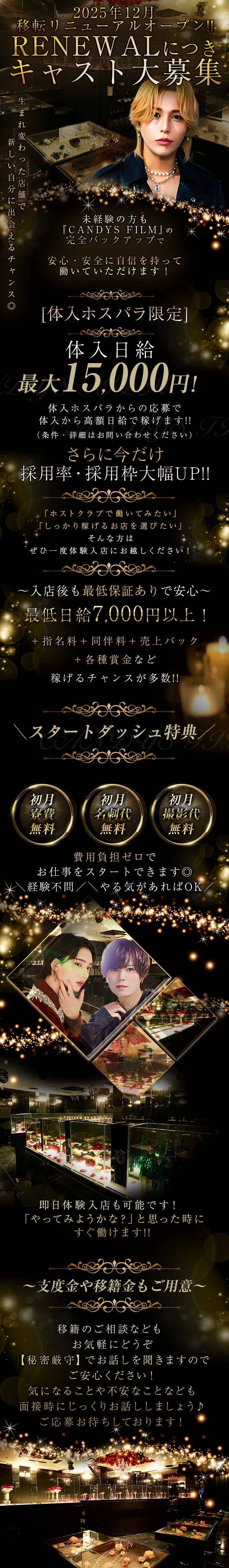2025年12月に移転リニューアルした人気店!現在採用枠を大幅に拡大し新たな仲間を大募集中です!歌舞伎町の『CANDYS FILM』ならホストとしての成功を掴めるはず★グループダンディーの育成システムやノウハウについてはお墨付き!さらに給与面も日給保証や高バック率で未経験からでもしっかり稼げる環境です♪初月寮費無料・初月名刺代無料・初月撮影代無料で、すぐにスタートできます!!即日体験入店も可能◎新しく高待遇の環境でスタートするチャンスは必見です!!