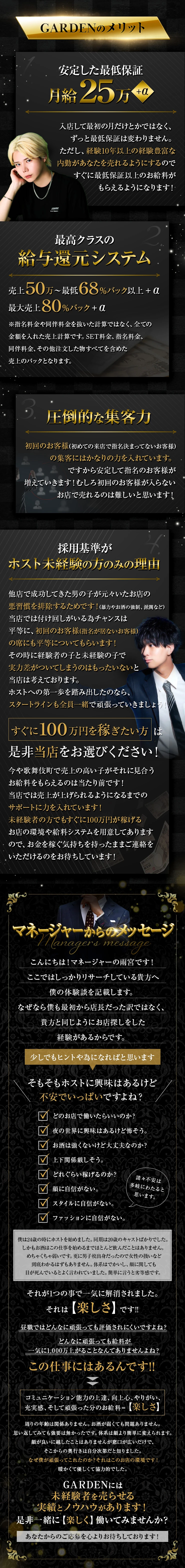 未経験でホストデビューをお考えの方に、是非チェックしていただきたいのが『GARDEN』の求人です!経験不問で18歳以上(高校生不可)のプレイヤーを募集中という同店。ナイトワーク歴10年以上のベテラン内勤スタッフが未経験者向けに用意した育成プログラムがあるらしく、ホストのイロハを基礎から教えてくれるのだとか♪また地方から出てくる人に向けて、上京支援の制度もあるみたいです!交通費の支給からはじまり、寮費無料など手荷物1つでデビューできる環境を用意してくれるそうですよ◎